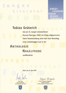 - 21. Junges Literaturforum Hessen-Thüringen: Aufnahme in Anthologie Nagelprobe Nr. 21, Urkunde